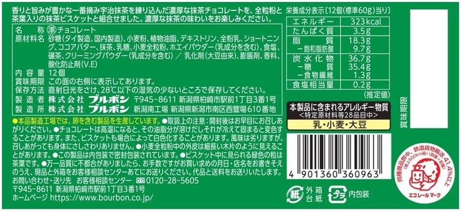 Bourbon Alfort Mini Chocolate – Rich Matcha is a refined Japanese confection that pairs luxuriously rich matcha chocolate with whole wheat matcha biscuits infused with tea leaves. Made using first-harvest Uji matcha from Kyoto Prefecture, it delivers a deep, aromatic green tea flavor with elegant bitterness and sweetness in perfect balance.